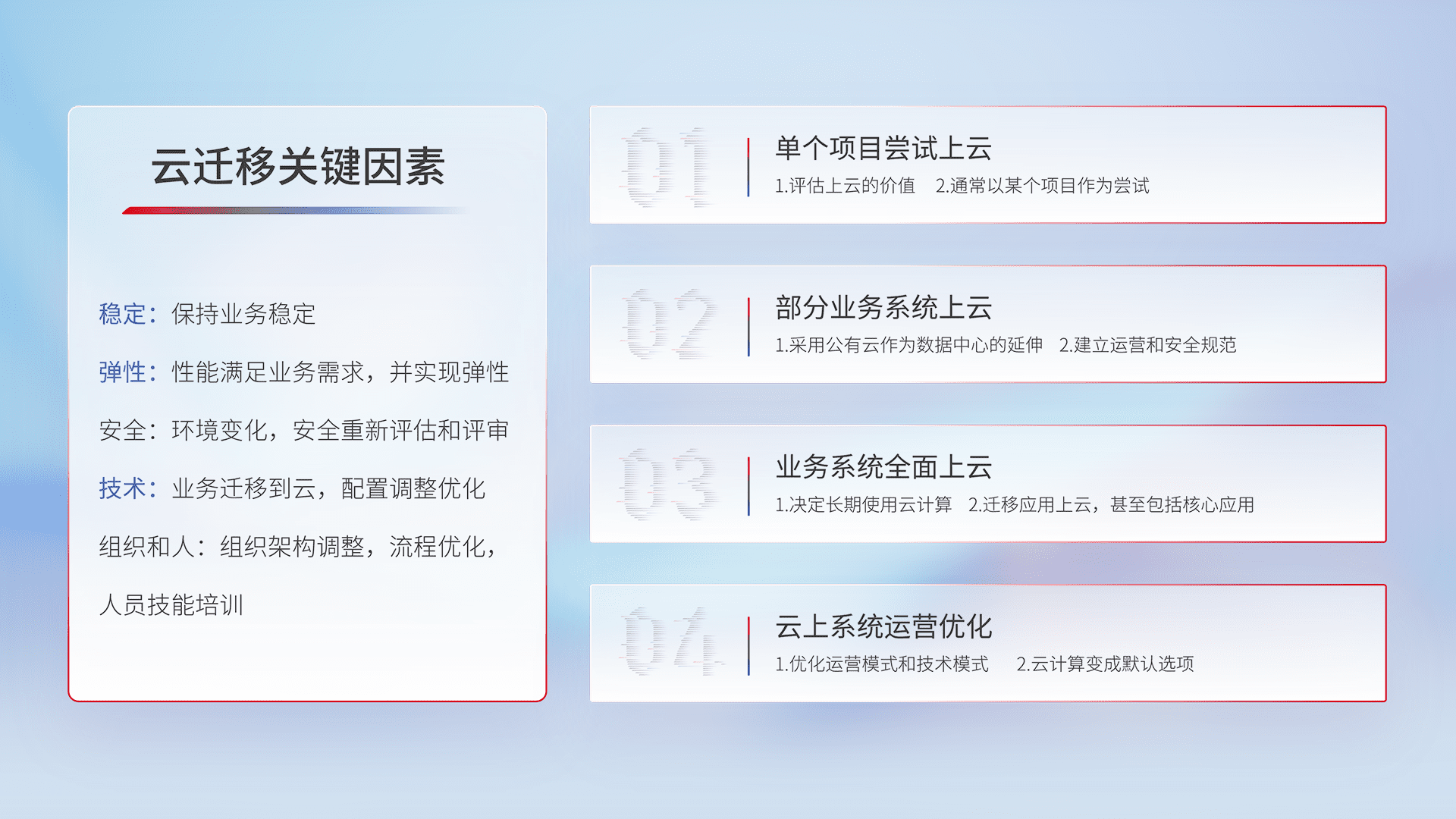 结合实际业务,,,,从规划设计、、云平台选型、、、云原生改造、、、数据迁移、、、、集成交付,,迁移全过程为客户识别最佳上云路径,,做好风险识别管理,,设计网络架构、、、、身份权限、、、安全审计合规、、操作审计、、、、日志审计、、、监控告警策略、、、多站点容灾设计等,,对云上基础设施进行整体规划,,提升IT治理水平,,,,以满足弹性、、、、高可用、、、高性能的需求。。